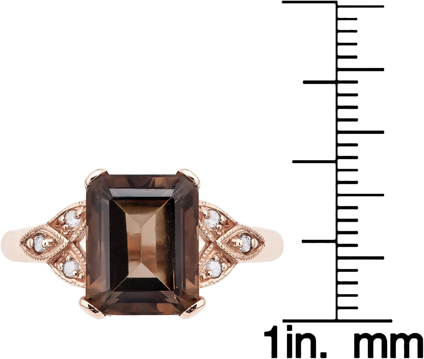 Enhance any wardrobe with this vintage inspired Smoky Quartz ring. This uniquely designed ring showcases a genuine natural 10 x 8 emerald-shaped Smoky Quartz center stone with diamond accent stones. The ring features milgrain work to create a truly vintage inspired design. Crafted of 10k rose gold, this piece is a wonderful addition to your jewelry collection.