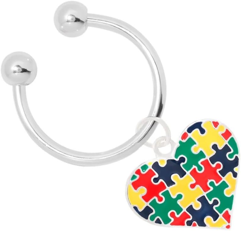 • KEYCHAIN SPECIFICATIONS: These autism awareness key chains are multicolored puzzle piece charms on horseshoe style key rings. The key rings are approximately 1 1/2 inches in diameter and the charms are approximately 3/4 inch by 3/4 inch.