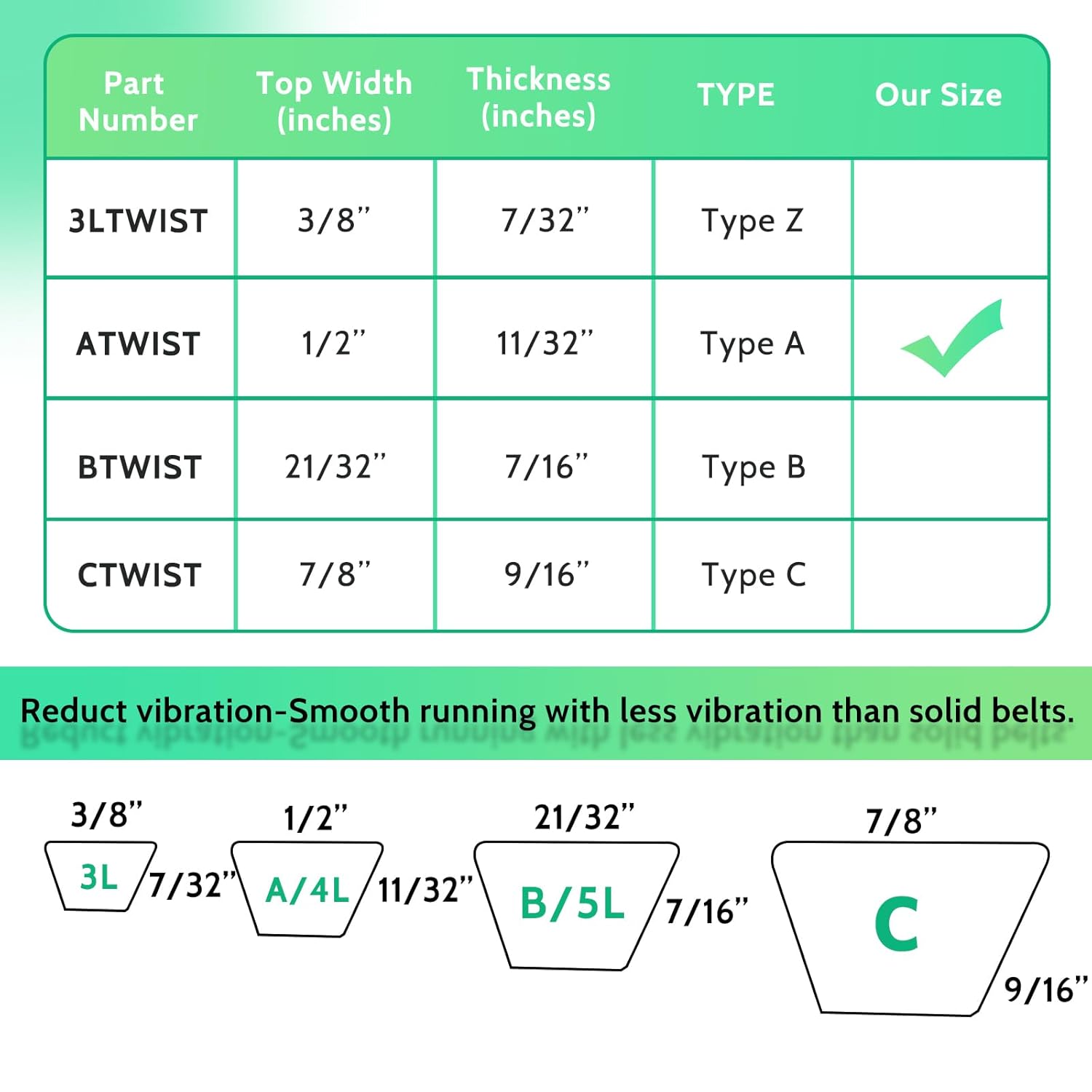 Item: Belt 1/2-inches x 5-feet, Type AMaterial: Polyester/Polyurethane CompositeFeature:Save Time - No wasted time dismantling drive components.Easy Installation - Belts are made to the required length by hand and roll on to the drive, no tools required.Longer Belt Life - Extremely high strength and low elongation under load results in increased belt longevity and durabilityReduce vibration - Smooth running with less vibration than solid belts.Their unique "quick connect" belt design provides easier and faster belt installation, even on captured or restricted access drives — no tools required! Belts are easily made up to the required length, by hand, in seconds and can be rolled onto a drive just like a bicycle chain. No need to dismantle drive components or change existing pulleys as PowerTwist V-Belts run in industry standard pulley grooves.Package Included:1 Pcs Adjustable Link V-Belt(1/2-Inch x 5 Feet)