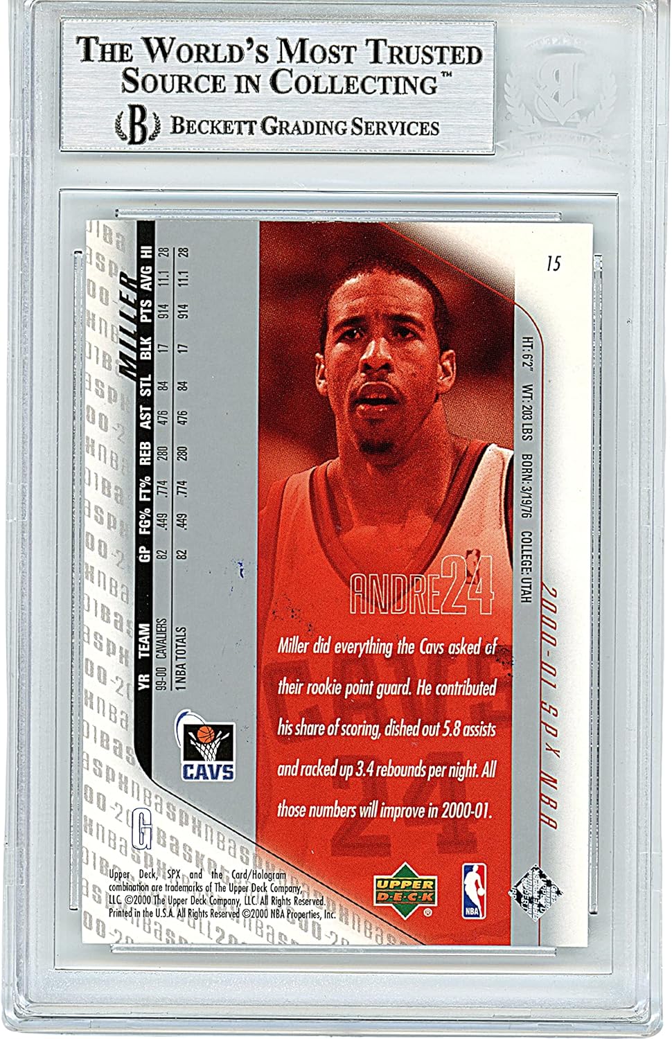 Add a verified Andre Miller autograph to your collection with this 2000 2001 Upper Deck SPx release, authenticated and encapsulated by Beckett Authentication Services. This Basketball Trading Card Slabbed format protects the card inside a sealed BAS holder while keeping the signature clear for display and collecting. authentication number shown in photos and verifiable in the Beckett database. A strong collectible for Cleveland Cavaliers fans and NBA point guard collectors, featuring a premium era SPx card that looks great in a display case. Ideal for gifting or building an authenticated basketball trading card lineup focused on guards.