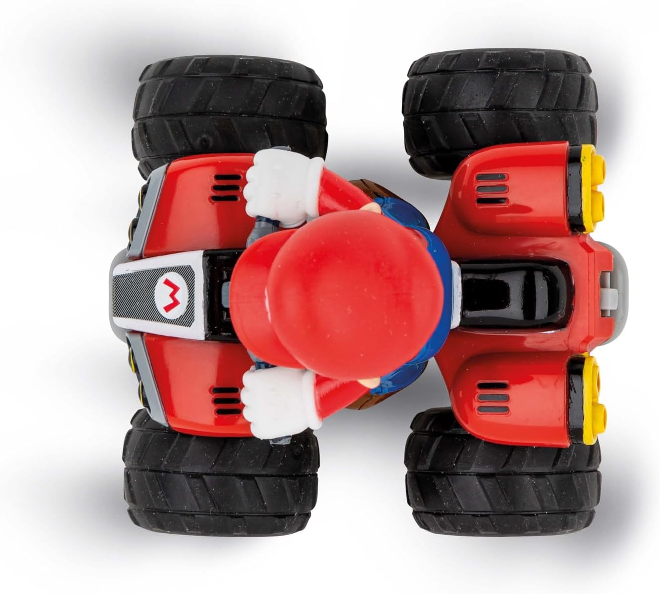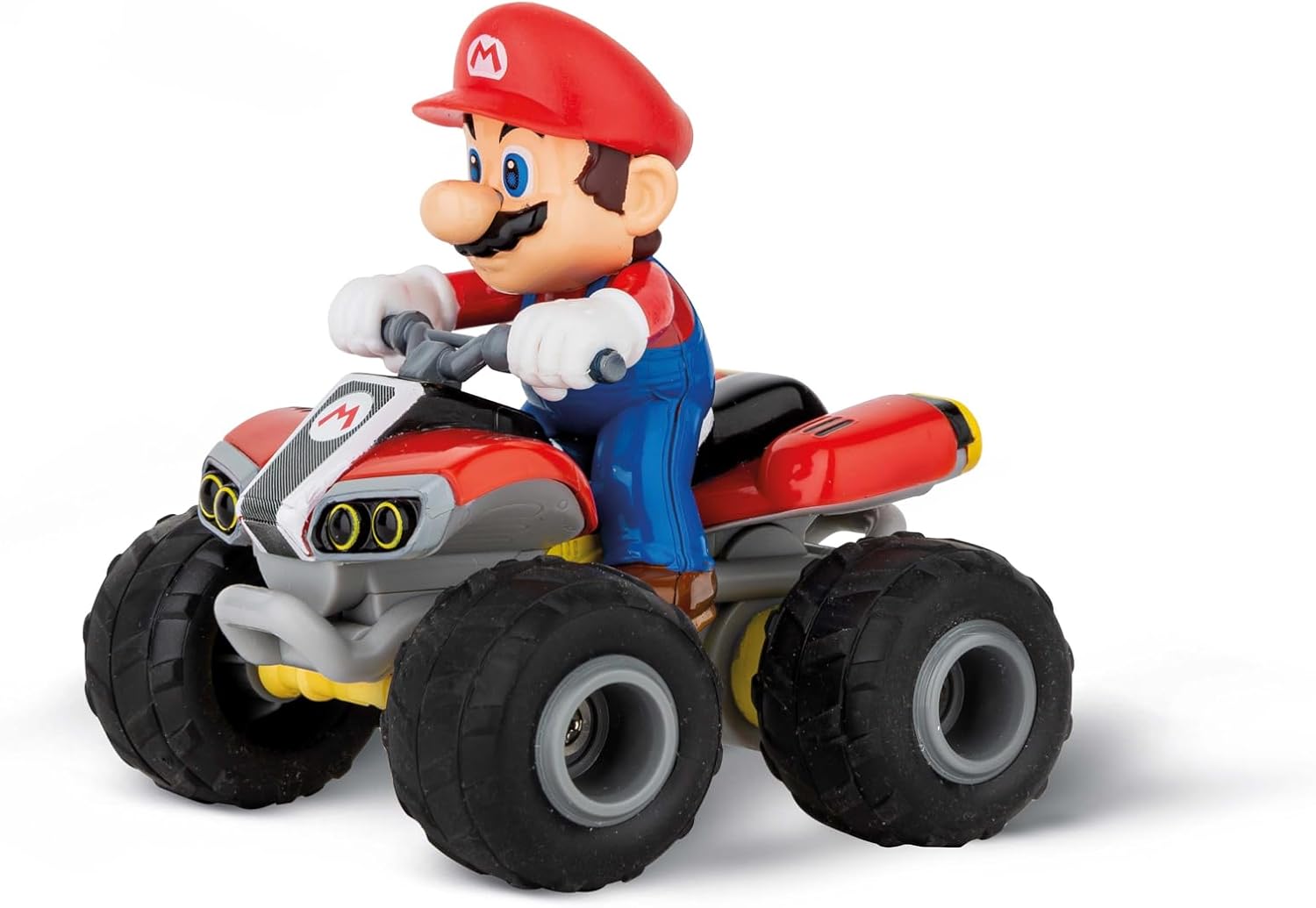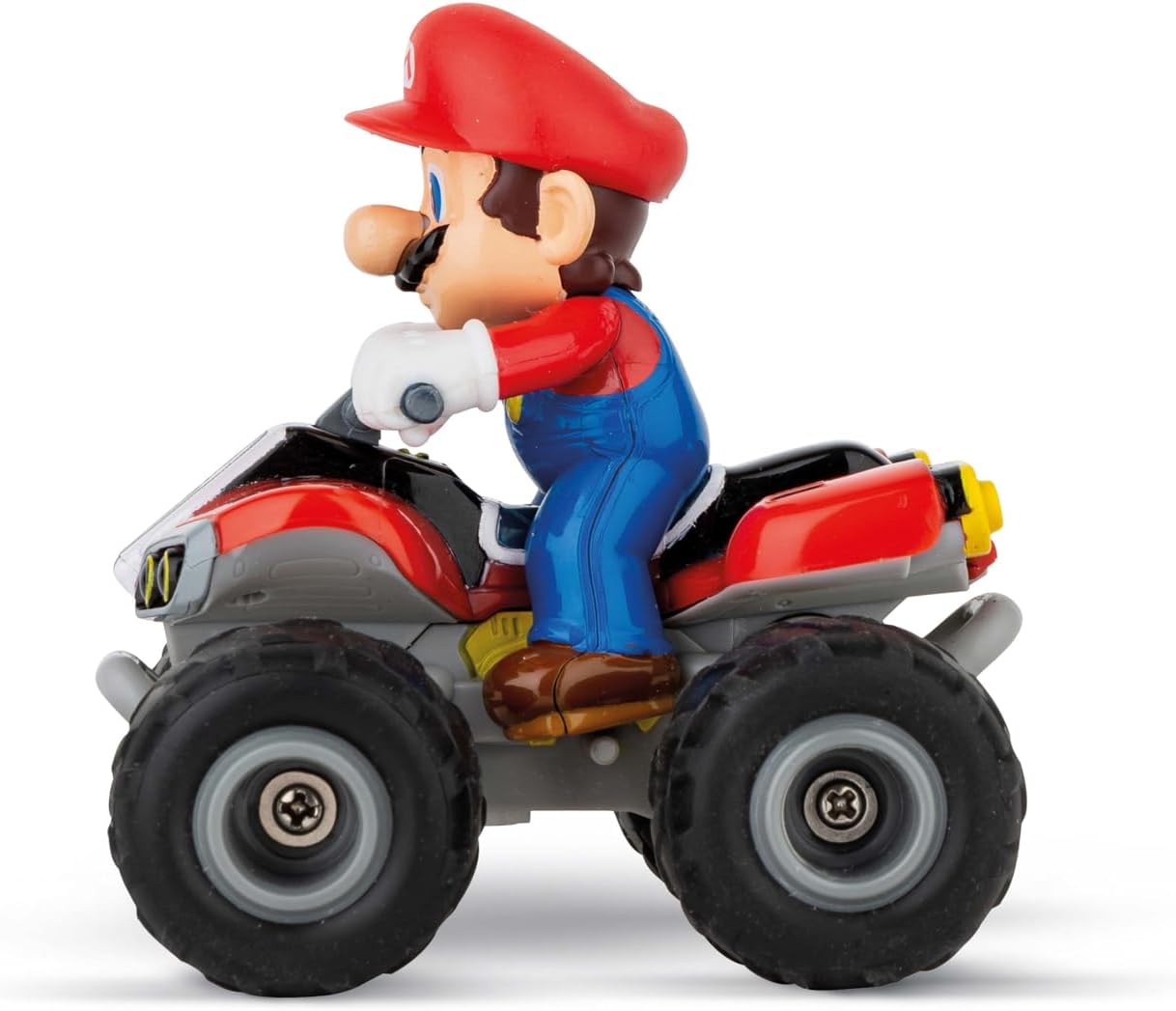 LONG runtime up to 8 min An ideal gift for little runners, Mario Kart fans and gamers Discover Mario Kart in miniature! Carrera RC licensed Mario Kart 1:40 scale quad bike delivers action-packed racing with total control thanks to 2.4GHz technology. With an impressive TOP speed of up to 9km/h and easy controls it is perfect for fans aged 6 and up. The heavy-duty quad has a special plastic body, full suspension chassis and pneumatic tyres for better performance. The LiFePo rechargeable battery allows driving times of up to 30 minutes. An ideal gift for little runners and Mario Kart fans. Start your own Mario Kart adventure now!