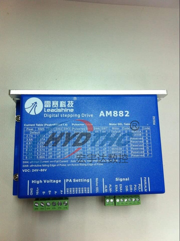 Introduction:The AM882 is a versatility fully digital stepping drive based on a DSP with advanced control algorithm. The AM882 is the next generation of digital stepping motor controls. It brings a unique level of system smoothness, providing optimum torque and nulls mid-range instability. Motor self-test and parameter auto-setup technology offers optimum responses with different motors and easy-to-use. The driven motors can run with much smaller noise, lower heating, smoother movement than most of the drives in the markets. Its unique features make the AM882 an ideal solution for applications that require low-speed smoothness.Features:- Fault output back to motion controllers.- Anti-Resonance, provides optimum torque and nulls mid-range instability- Motor auto-identification and parameter auto-configuration technology, offers optimum responses with different motors- Built-in auto-configuration parameters for Leadshine stepping motors: 57HS09, 57HS13, 57HS22, 86HS35, 86HS38, 86HS45, and 86HS85- Multi-Stepping allows a low resolution step input to produce a higher microstep output for smooth system performance- Besides programmable microstep resolutions from full-step to 102,400 steps/rev, there are also 7 DIP switch settings: 400, 800, 1,600, 3,200, 6,400, 12,800, and 25,600 steps/rev- Besides programmable output current from 0.1A to 8.2A, there are also 7 DIP setting output current settings: 2.7A, 3.6A, 4.6A, 5.5A, 6.4A, 7.3A,8.2A- Supply voltage up to +80 VDC,- Pulse/direction input frequency up to 200 KHz- TTL compatible and optically isolated input- Automatic idle-current reduction and software configured reduction rate- Suitable for 2-phase and 4-phase motorsOver-voltage, over-current, phase-error protections- Support PUL/DIR and CW/CCW modes- Over-voltage, over-current, phase-error protections Applications:Suitable for a wide range of st