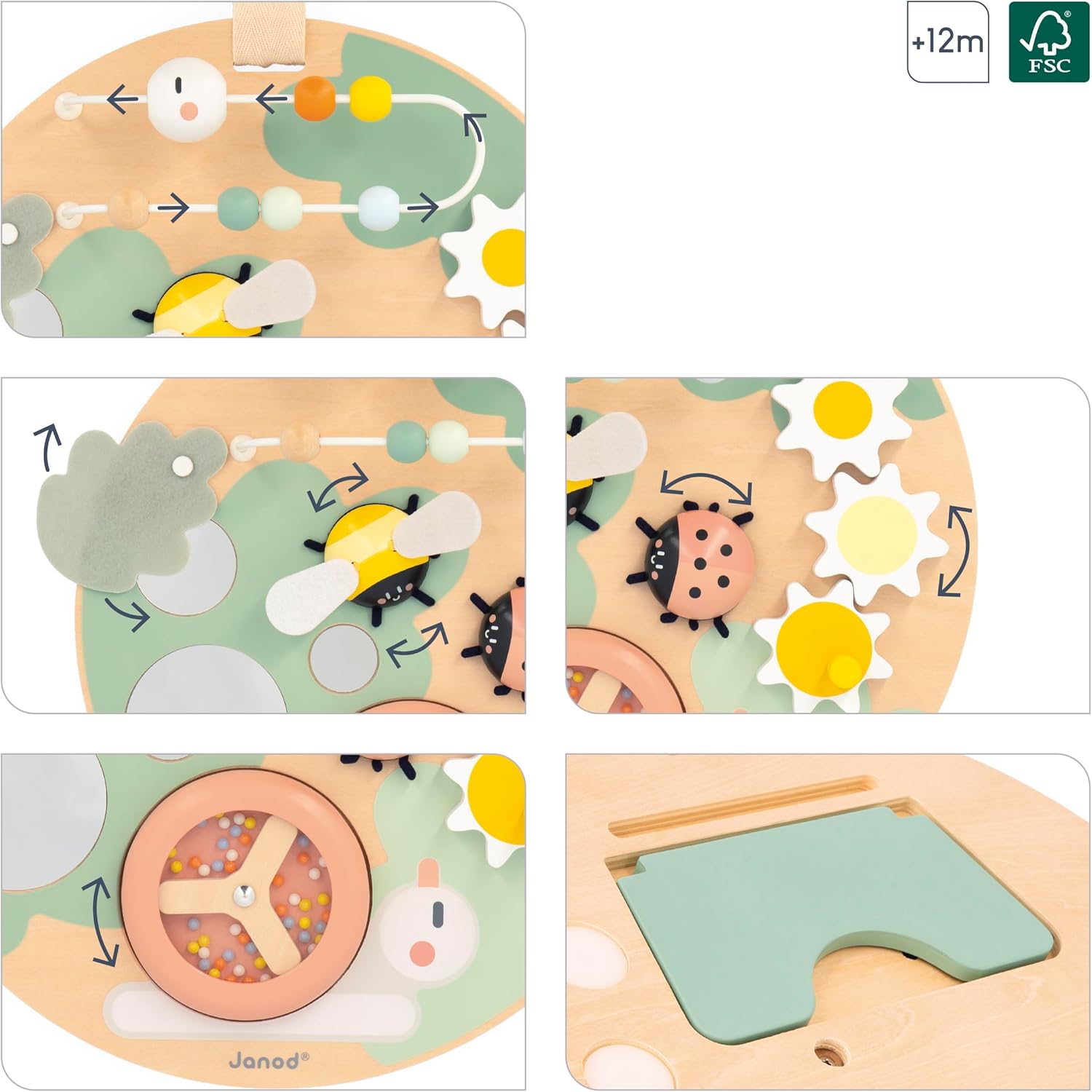 The Sweet Cocoon Multi-activity Busy Board is a versatile and engaging early-learning toy designed for babies aged 12 months and up. This wooden activity panel offers a multitude of activities that stimulate a child's hearing, sight, touch, and fine motor skills, ensuring hours of discovery-filled play. Key features include seven engaging activities such as flower-shaped gears, a noise-making bee, a ladybug that screws and unscrews, a caterpillar-shaped abacus, mirrors for self-observation, a snail with a spinning shell, and an ultra-soft felt leaf with a distorting mirror. The modular design allows it to be hung on a wall or cot using a Velcro strap or positioned at a 45° angle with a removable stand. Made from certified wood with natural finishes and soft colors, it is part of the Sweet Cocoon collection known for its gentle aesthetics and rounded shapes. This toy encourages exploration and manipulation, enhancing dexterity and stimulating curiosity and sensory development.