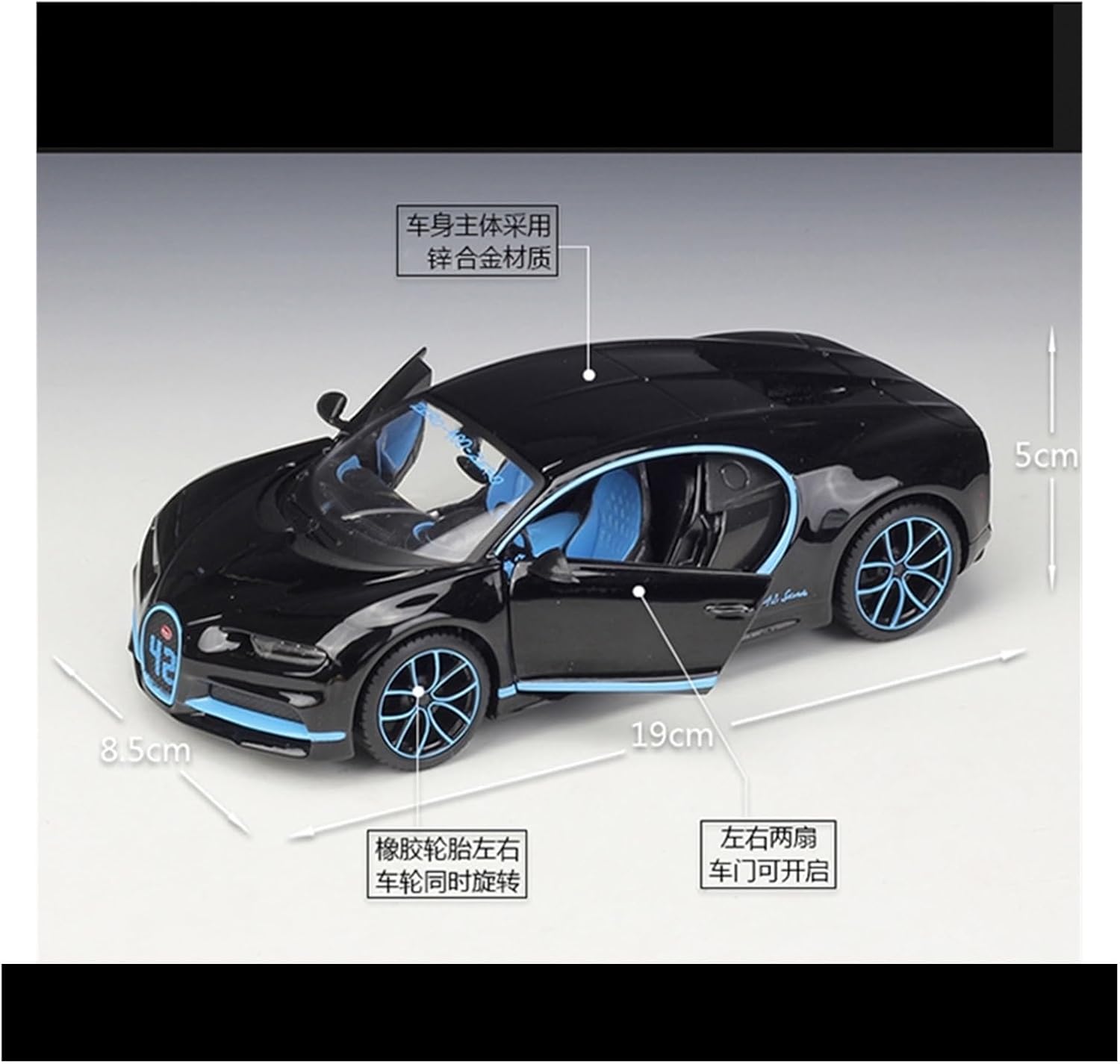 Product SpecificationsProduct Name:1:24 For Bugatti ChironMaterials: Alloy body, rubber tires, ABS plastic for remaining componentModel size: 19*8*5cmModel features: The body is made of zinc alloy, rubber tires, the wheels rotate at the same time, and the doors can be openedModel Features:Wheels can be turned, front wheel steering wheel can be linked, front cover, left and right doors can be opened, the trunk can not be opened, four-wheel shock absorption.Warm tips1. The model data is measured manually, there is a slight deviation, please understand. 2. Pictures are taken in kind, due to monitor color difference, for reference only! Please understand!