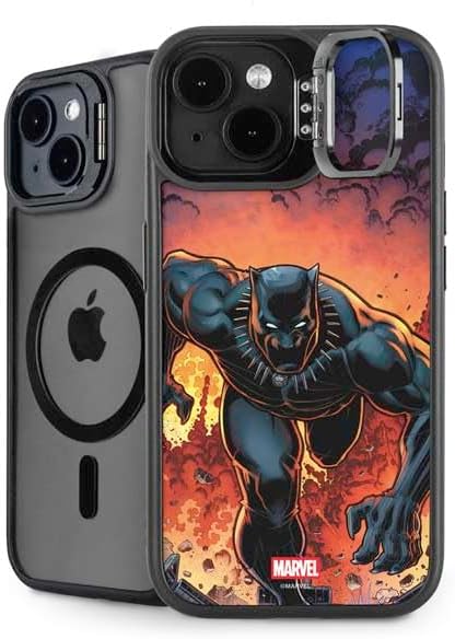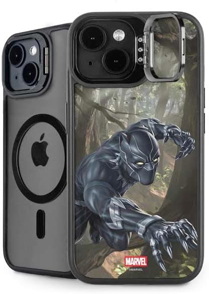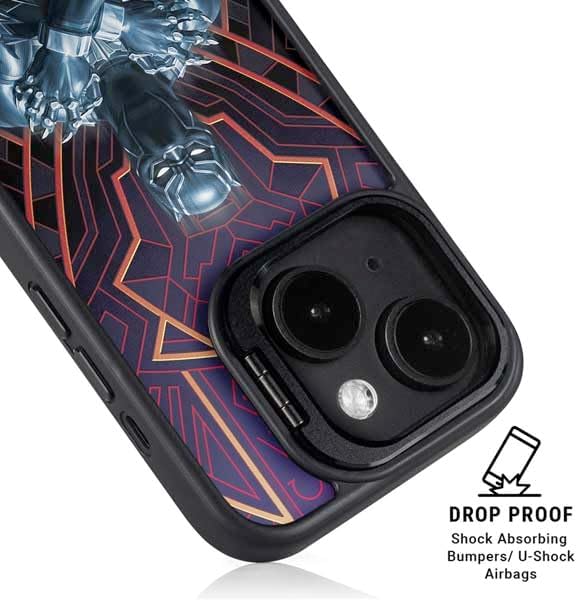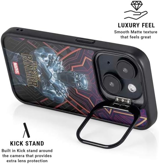 The Marvel Black Panther Wakanda Salute Kickstand Case compatible with iPhone 14 is the ultimate in versatile protection and convenience. Featuring an innovative lifted camera ring with a built-in stand, it allows hands-free video watching with adjustable angles from 0 to 150 degrees. This premium Black Panther Case supports wireless charging and is fully compatible with MagSafe, offering a sleek design without compromising on durability or functionality.