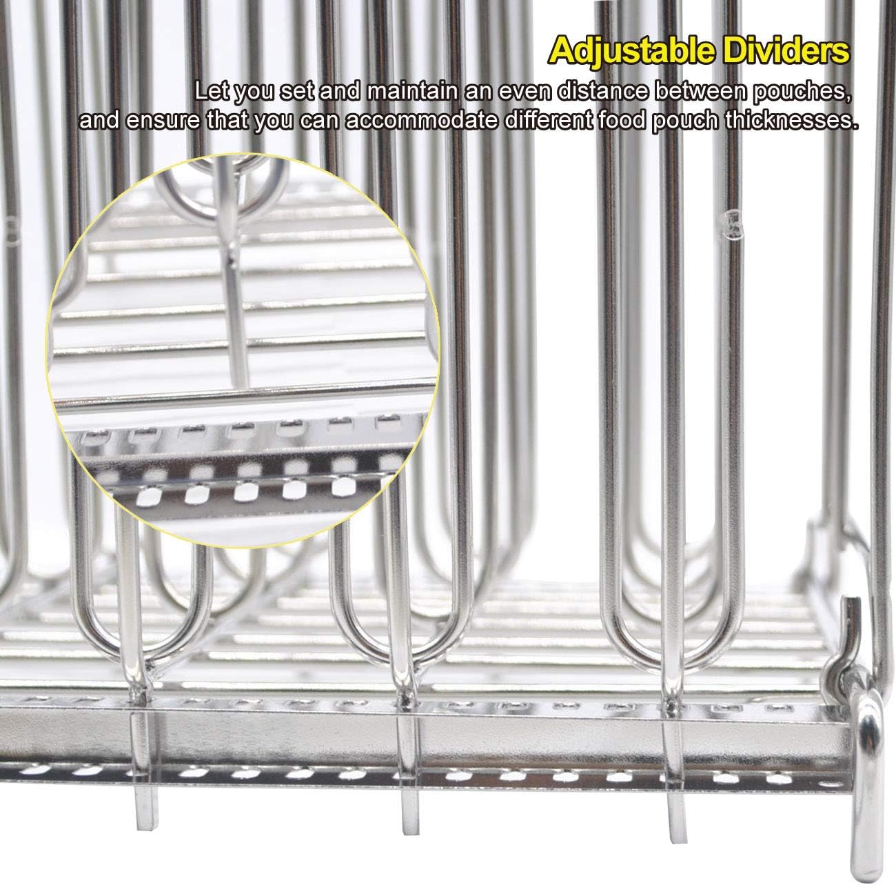 Buying a sous vide cooker? Grab a sous vide rack too!As you're perfecting your sous vide cooking techniques, you may find that pouches clump together or float away, reducing water circulation and generally ruining the results. The TriRock Sous Vide Rack directly solves all of your sous vide cooking concerns! It lets water circulate freely, and keeps pouches separate and still, ensuring that your ideal dish is truly perfect.Made of extremely durable 304 stainless steel, this rack is rust-proof and stain-resistant, so you can enjoy years of worry-free use. Adjustable dividers let you set and maintain an even distance between pouches, and ensure that you can accommodate different food pouch thicknesses. Collapsible design allows the rack to pack flat for easy storage between uses. Meanwhile, this rack is compatible with almost every 12-qt sous vide container, including Rubbermaid. It can also be used to keep foods separate during smoking or freezing.