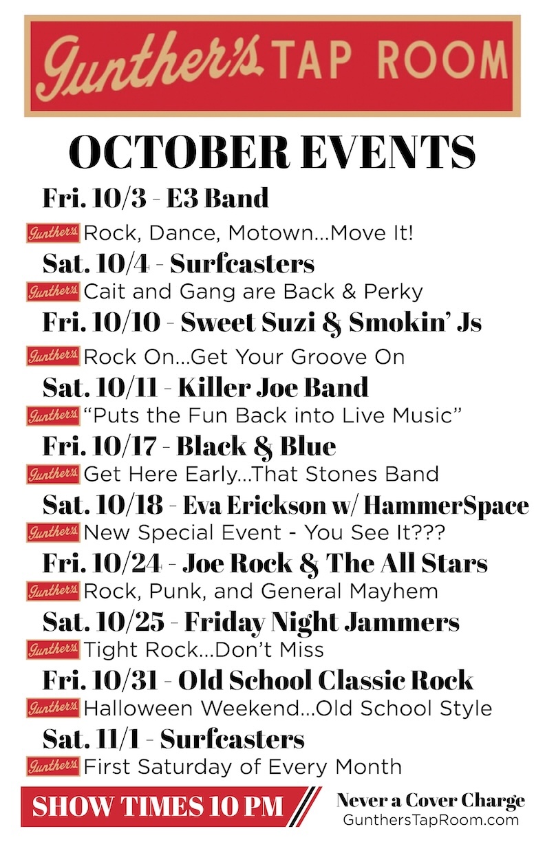 Hello -- March brings us St Patrick's Day AND the Vernal Equinox brings us Spring! But more importantly Gunther's brings you live music -- Along with our staples in the local music scene, we have some newcomers added to the list notably Broken Halo on March 8th. Don't miss St Paddies Day weekend with Limewired returning after a short layoff and some Grunge with Stone [...]