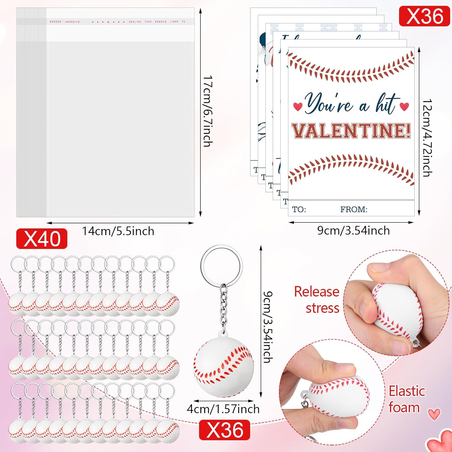 Features: Charming valentine keepsake: These Valentine school themed sports cards offer a delightful way to connect with classmates. Each 9*12 cm card is crafted from steady paper, ensuring they endure the test of time. The package, including 36 cards, keychains, and self-adhesive bags, provides everything needed for heartwarming exchanges. Convenient gifting solution: Ideally sized at 9*12 cm, these 36 sports cards are tailored for easy distribution and storage. Also, the inclusion of 36 keychains and self-adhesive bags in the package simplifies gifting, making it a seamless experience for busy parents alike. Share the love with ease and style. Specifications: Material: paper, plastic, pu Color: multicolor Size: The Valentine's cards are about 3.54 x 4.72 inches/ 9 x 12 cm The transparent bags are about 5.5 x 6.7 inches/ 14 x 17 cm The stress balls keychains are about 1.57 inches/ 4 cm in diameter Package includes: 36 x Valentine's cards 36 x Transparent bags 36 x Stress balls keychains Notes: Manual measurement, please allow slight errors on size. The color may exist a slight difference due to different screen displays