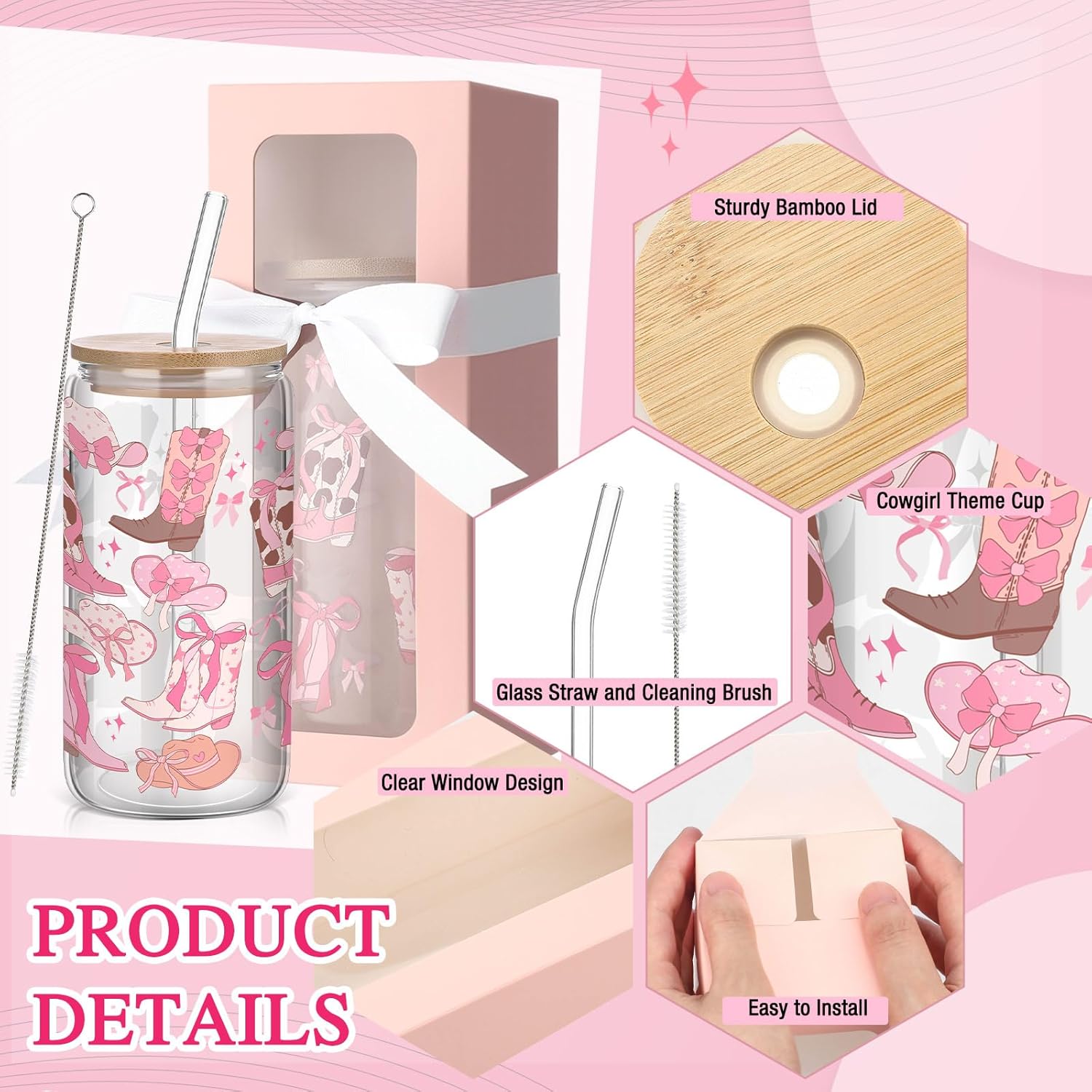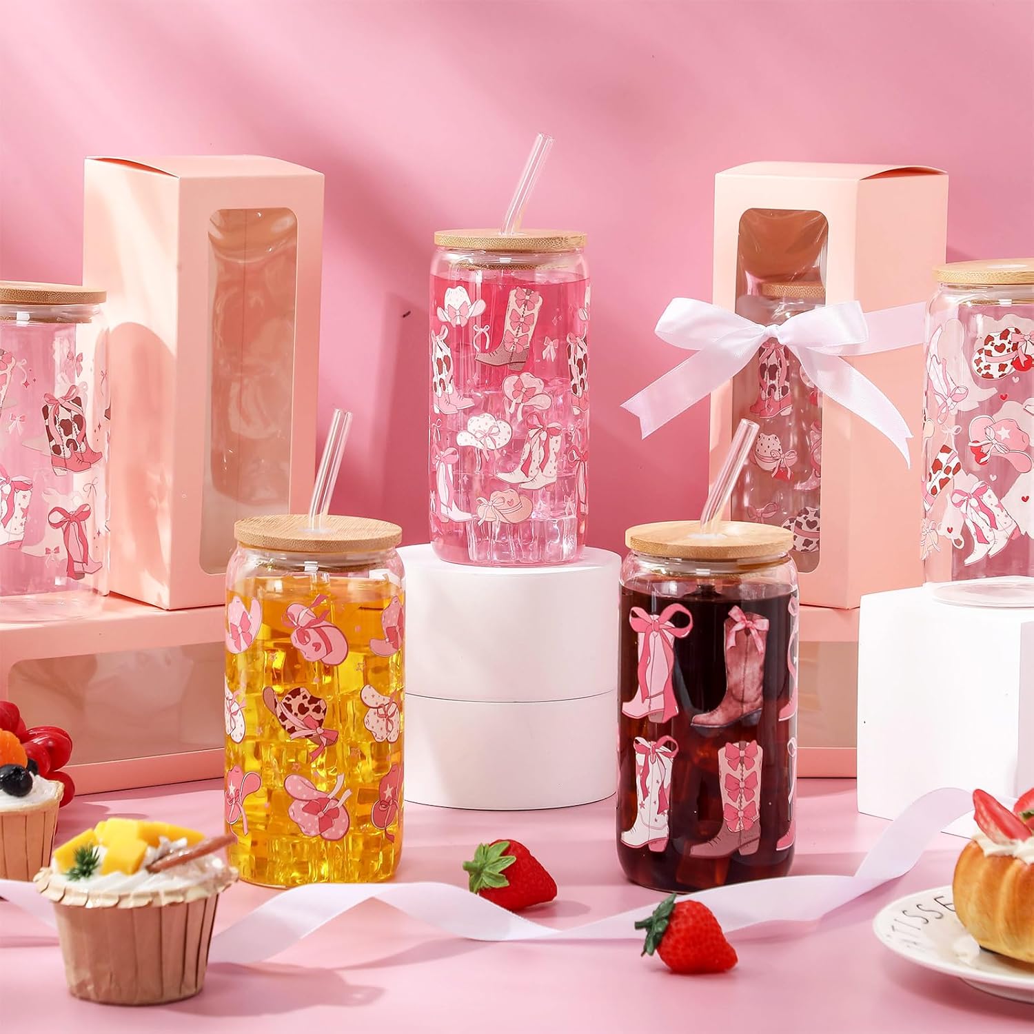 | Included Components | 6 cowgirls bow aesthetic glasses, 6 lids, 6 straws, 6 straw brushes, 6 pink gift boxes and 6 white ribbons |