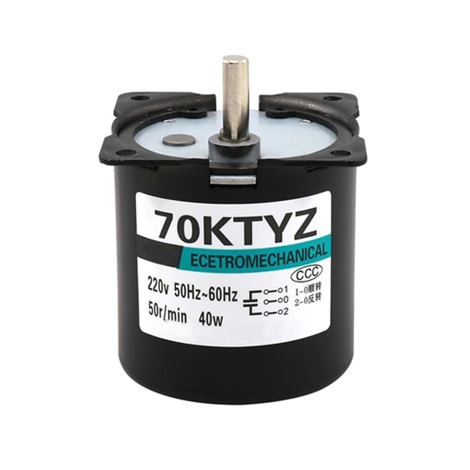 MotorsMotor introduction1. 70KTYZ miniature permanent magnet synchronous motor 220V AC with capacitor2. The motor has the following voltage options: AC 220V3. AC 220V; You can choose the no-load speed: 2.5rpm; 5 rpm; 10 rpm; 15 rpm; 20 rpm; 25 rpm; 30 rpm; 50 rpm minute; 60 rpm; 80 rpm; 110 rpmThe rated torque is between 3.5 and 160KGF.CM; select a no-load speed under AC 220V, and there will be a corresponding rated torque, please refer to the parameter table below.4. Motor rotation direction: CW and CCW; support reverse5. Power: 40W6. Working environment temperature: the lowest temperature -10 degrees to the highest temperature 70 degrees 7. The outstanding features of the motor: the motor is a permanent magnet synchronous motor; the interior is a metal gear; low speed, low noise; supports 24 hours of continuous operation; does not support speed adjustment; the service life is 6000 hours under normal use; use materials; small size; High Torque; Low Power Consumption; Ease of Use8. Motor application range: automatic grill; automatic dining table; curtain machine; stage lighting; dishwasher; automatic control, etc.9. Please refer to the information below for the torque, size, product picture or other information of the motor. ThanksThe following is the motor parameter tableRated frequency: 50Hz/60HzInsulation class: EThe materials and structure of the motor are introduced below.1. Full metal gear2. The wire inside the rotor is made of pure copper. More conductive, temperature resistant, prolong motor life.3. Imported lubricating oil is used to effectively control the temperature rise speed of the motor and make the motor rotate more smoothly.Size is for reference only, measurement will be slightly different, please note before purchasingWiringThe two black wires of the motor are connected to AC 220VThe green wire from the motor goes to one of the wires from t