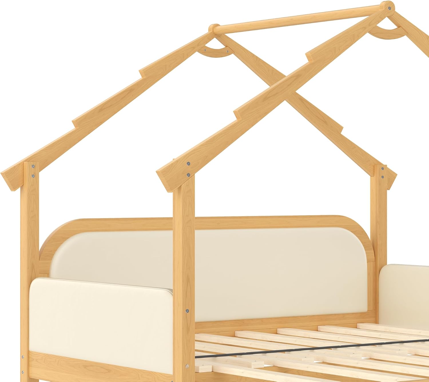 Boasting a charming house silhouette and soft, versatile hues, this Kids Wooden House Bed blends seamlessly with modern, or any style of kids’ room decor. Assembly is hassle-free—clear step-by-step instructions and all necessary hardware are included, no fancy tools required, so you can put it together quickly on your own. Safety is our top priority, with soft padded rails and a sturdy solid wood frame to keep little ones protected during sleep and play. More than just a bed, it doubles as a whimsical "play castle" (the frame is perfect for hanging curtains or decor) and offers flexible under-bed space for storage or extra play area. Ideal for rest and fun alike, it transforms any room into a cozy, kid-approved haven.