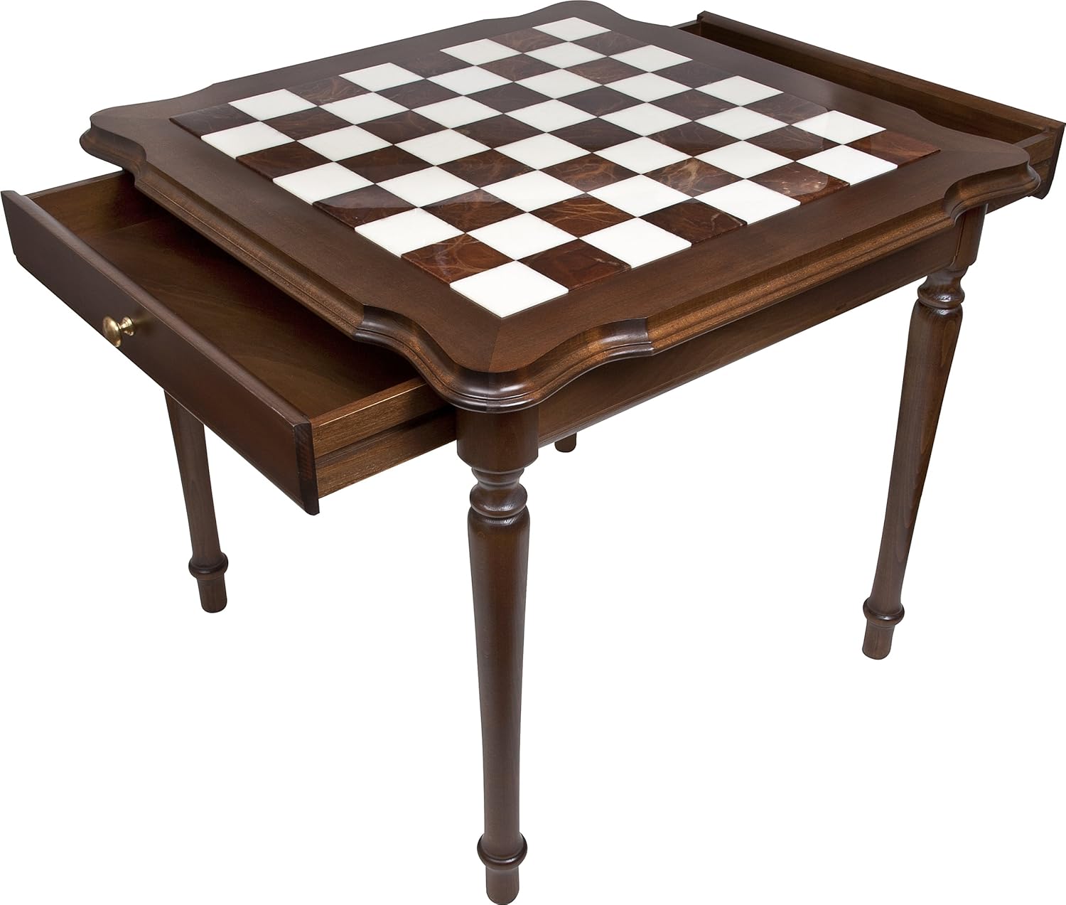 Hand crafted of solid maple and walnut. Heavily weighted with Two Extra Queens. |Luxury chess/checkers table from Italy. Hand polished Italian marble with individually inlaid squares with a walnut finished frame and beautiful scalloped corners. King Height: 6". |Chessmen are naturally heavy in weight.| Base Diameter: 2 ".|Squares: 3 1/8" sq.| Board Dimensions: 33" X 33" X 30".| Inside drawer dimensions: 23 1/2" X 12 1/2" X 2 1/2" | This item ships as oversize.