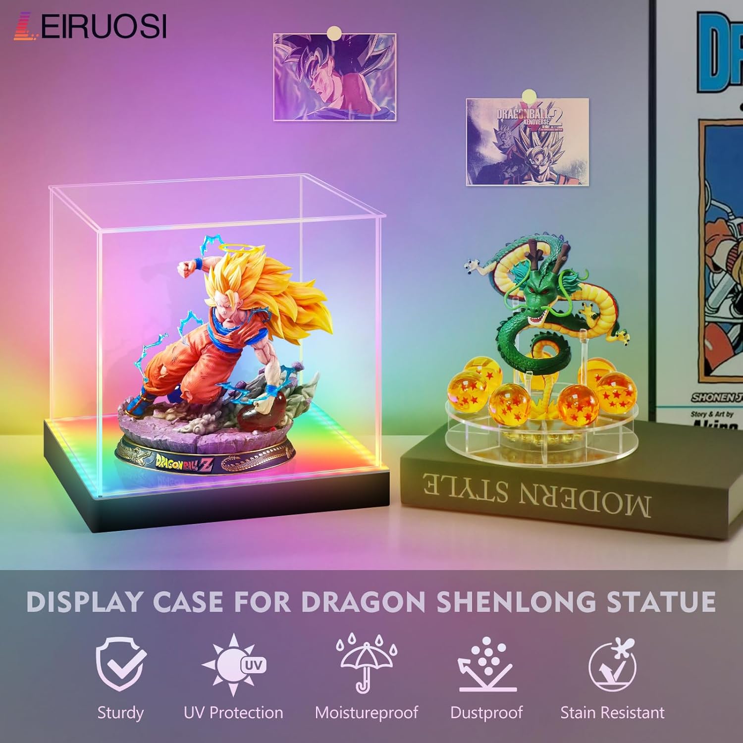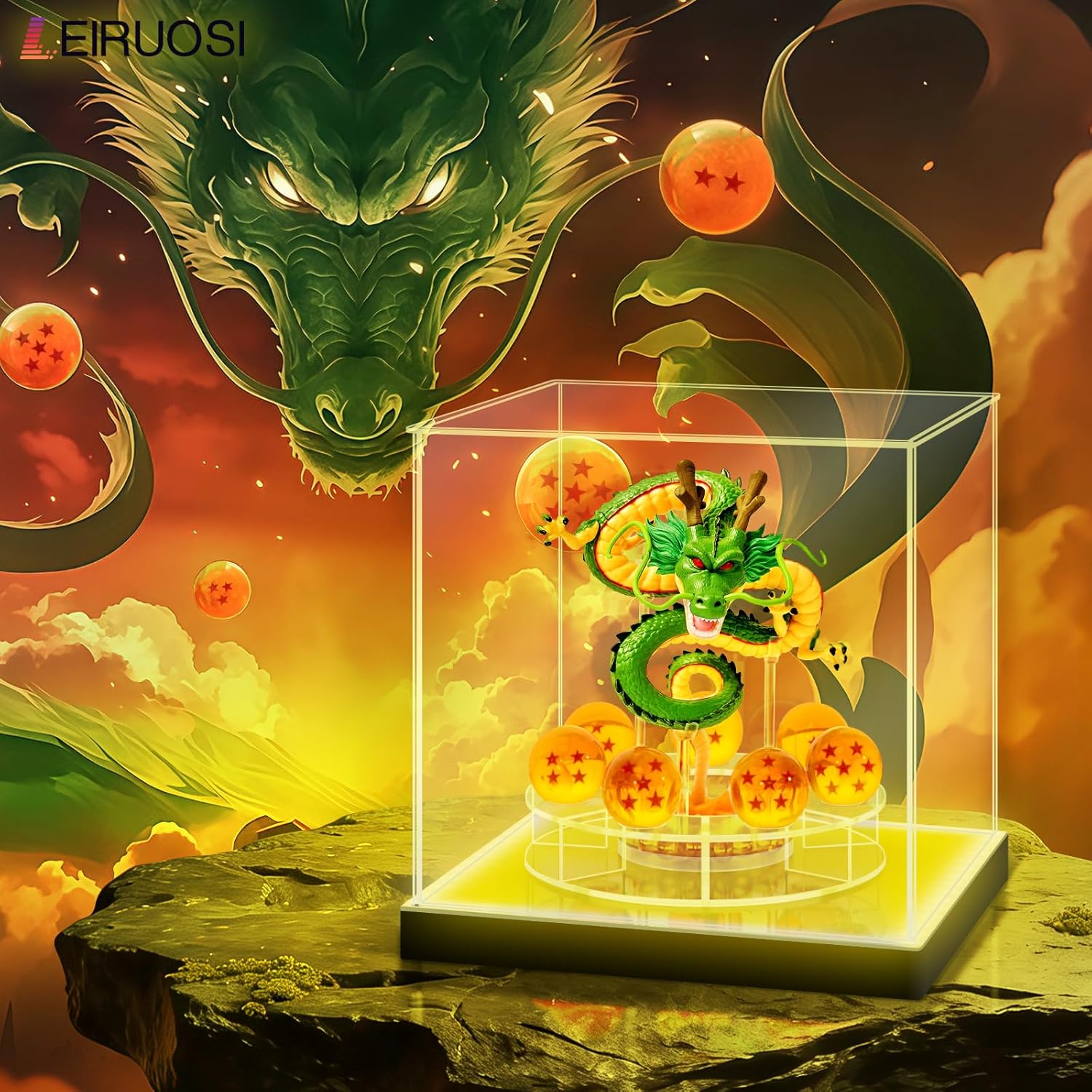 • Complete & Immersive Display Set: This all-inclusive package is designed for immediate display and impact. It features a majestic dragon stand, a dedicated stand for the iconic dragon ball, and a vibrant RGBW acrylic display case with integrated lighting. The lighting system brings the entire scene to life, creating a dynamic and captivating centerpiece for any room.