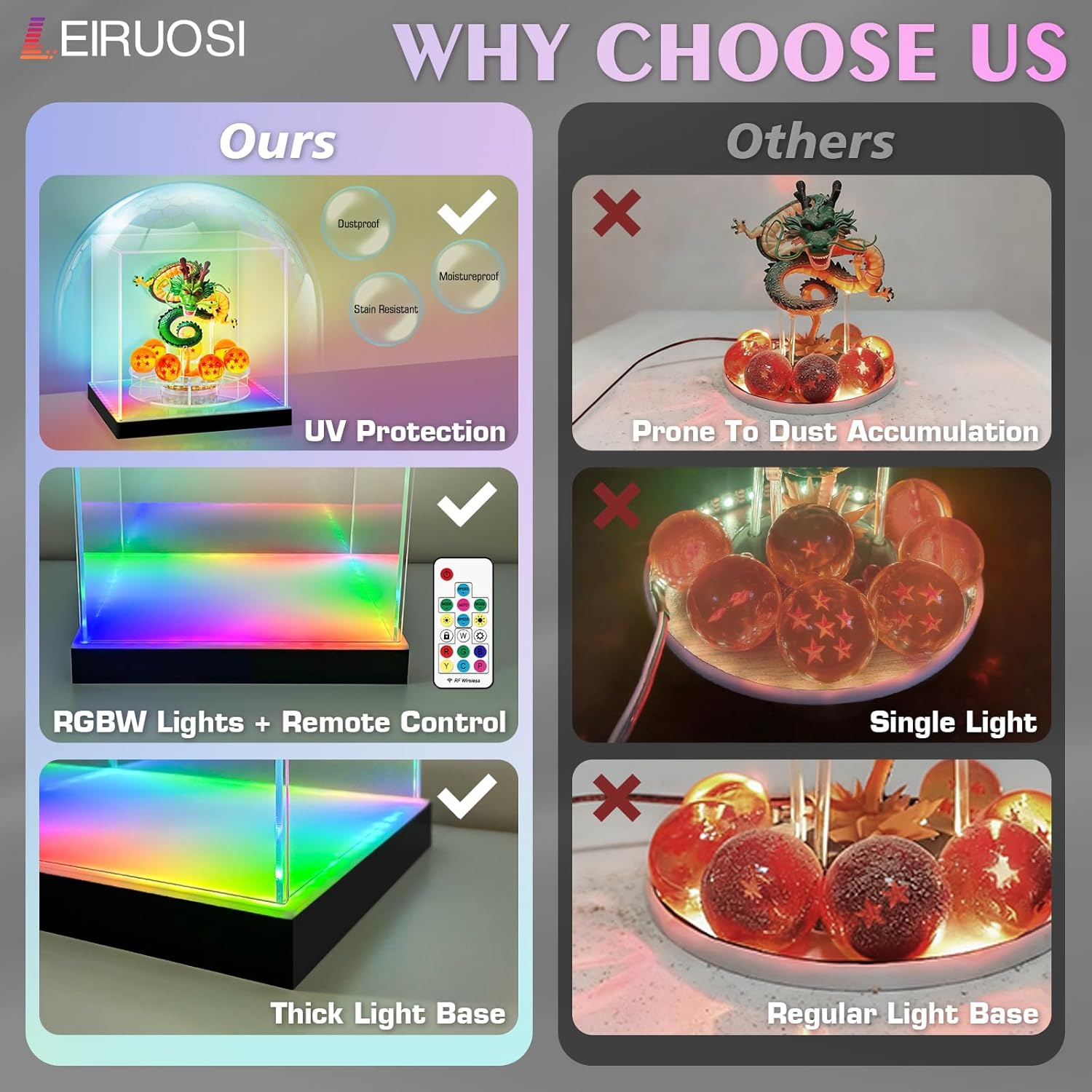 • Dynamic Bottom RGB Lighting in Premium LED Acrylic Display Case - Elevate your collectibles with vibrant underglow! This LED acrylic display case features customizable RGB modes (static/fade/pulse) to dramatically highlight figures, miniature, or collectibles. Our clear LED display case ensures 360° distortion-free viewing while preventing dust, yellowing, and fading.
