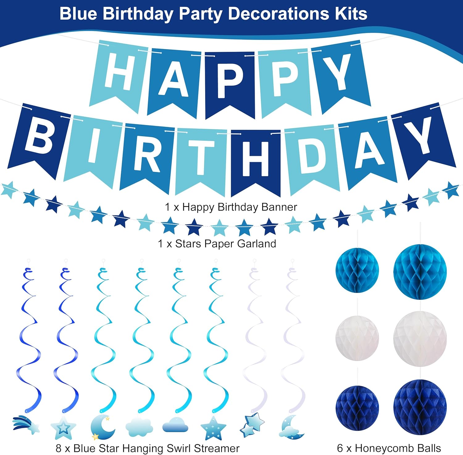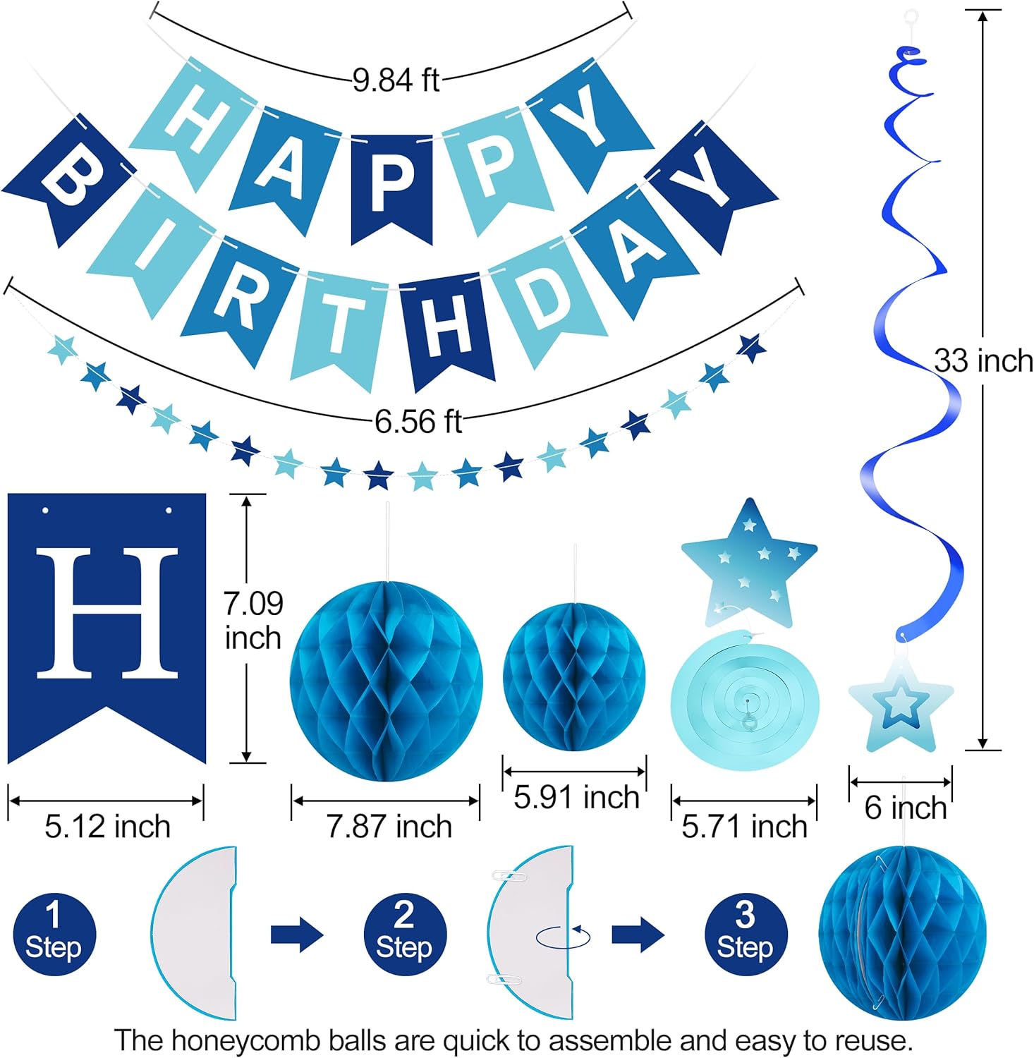 | Included Components | 1pcs 6.56 ft star paper garland, 1pcs 9.84 ft blue happy birthday banner, 6pcs tissue paper pom poms, 8pcs ceiling decorations hanging |