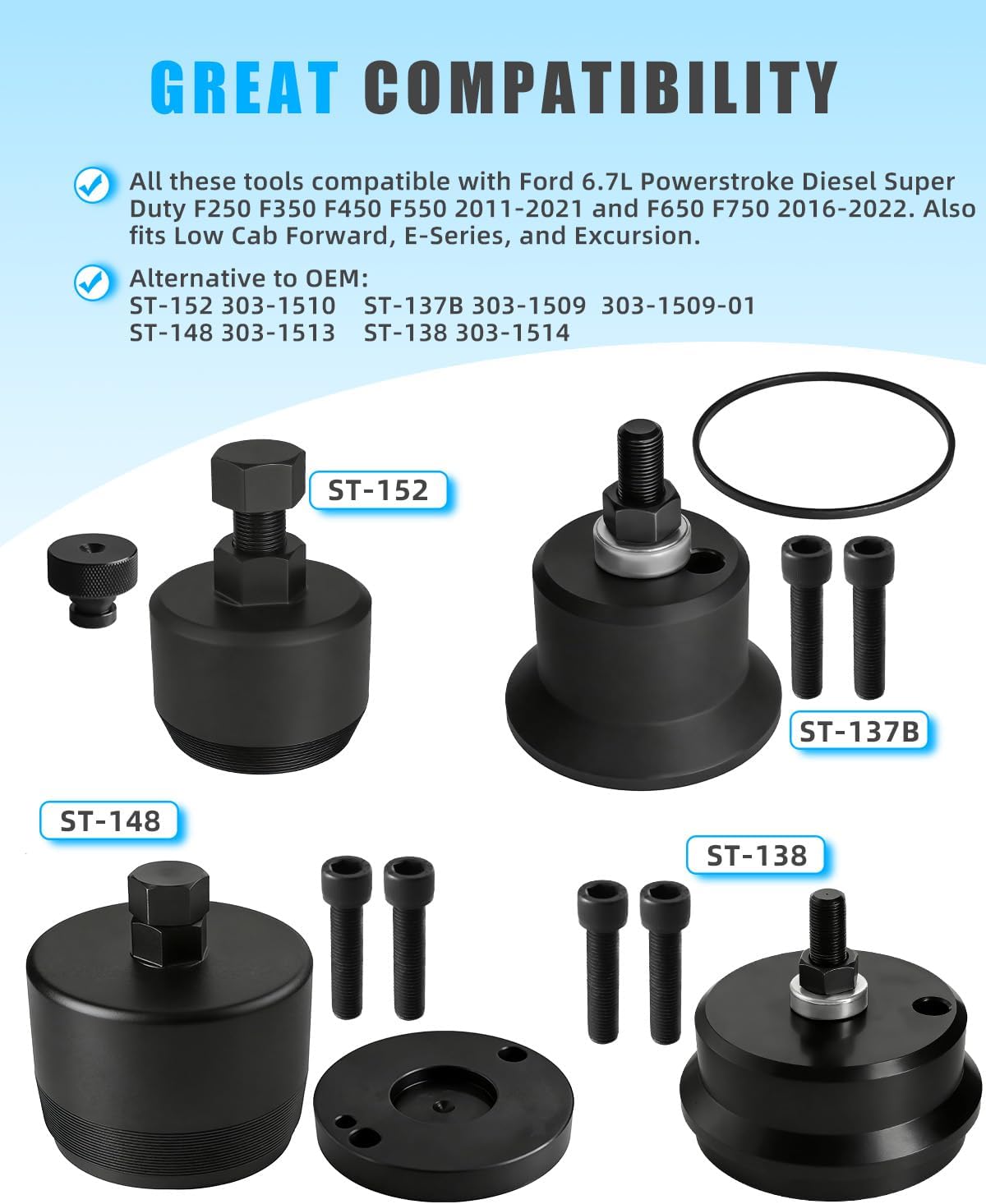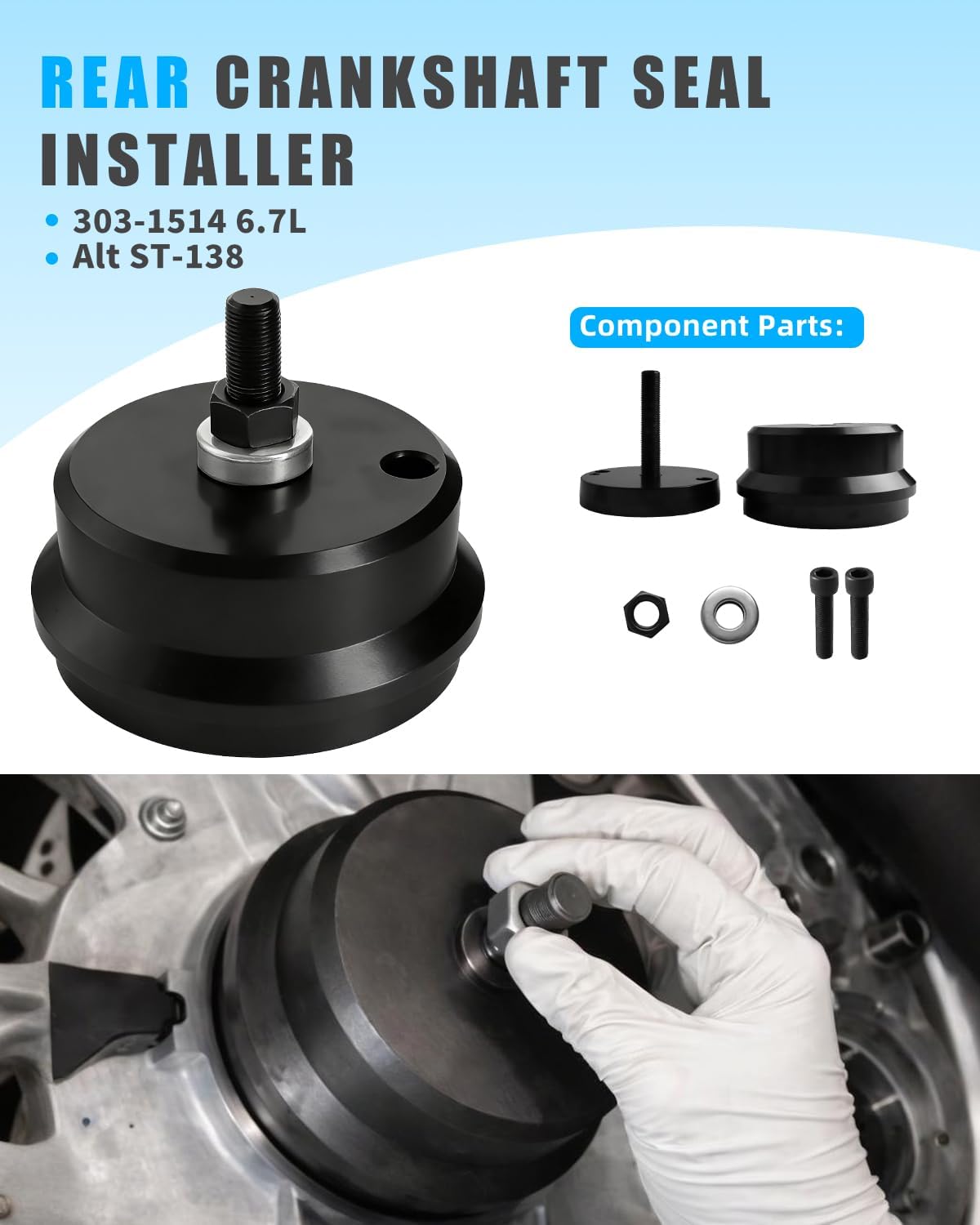 【Great Compatibility】This front & rear crankshaft seal remover and installer tool set fits Fo-rd 6.7L Powerstroke Diesel Super Duty F-250/F-350/F-450/F-550 (2011–2021) and F-650/F-750 (2016–2022). It also works with Low Cab Forward, E-Series, and Excursion models. Note: The front adapter ring is only compatible with 2011–2019 BC3Z-6700-A seals; do not use it on 2020+ LC3Z-6700-A seals to avoid fit issues.