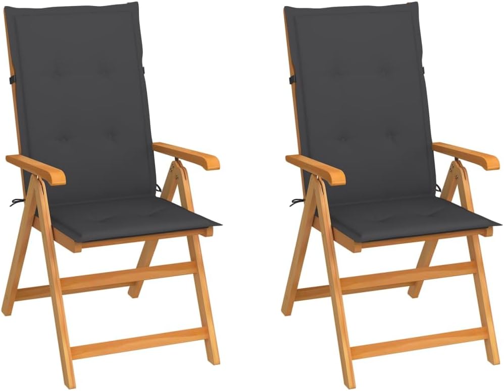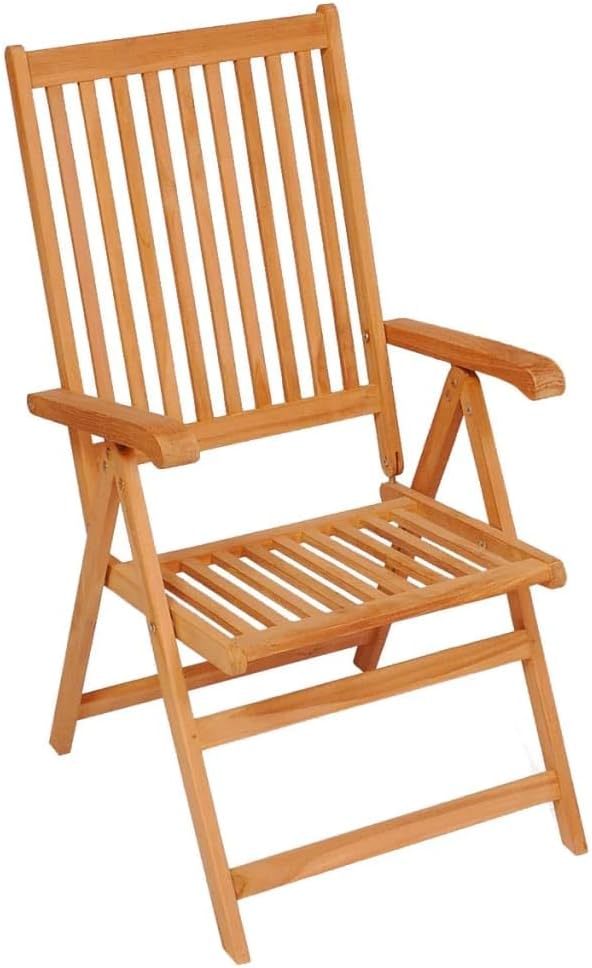 This wooden patio chair set is an addition to your garden or patio. It is ideal for relaxing, chatting with family and friends or just enjoying the weather.Constructed from extremely durable teak hard wood, this piece of teak furniture has been seasoned, kiln dried and then fine sanded to give a very smooth appearance. Teak wood is known for its exceptional strength and weather resistance, making it far more suitable for patio furniture than any other kind of wood. Teak wood is the choice if you want to purchase a long lasting piece of patio furniture.The chair's backrest can be adjusted in 7 reclining s, so you can always find the comfortable position. It is also lightweight, making it easy to move around. The outdoor chair can also be folded to save space when not in use. The included cushion is more than a practical addition; it also has a decorative function.Cushion color: GreenMaterial: Fine sanded teak hard wood with waterbase finishCushion material: Fabric (100% polyester)Dimensions: 22.4" x 28.1" x 42.9" (W x D x H)Seat width: 18.7"Seat depth: 15.7"Seat height from the ground: 17.7"Armrest height from the ground: 25.2"Cushion dimensions: 47.2" x 19.7" x 1.2" (L x W x T)7 reclining positionsFoldableDelivery contains:2 x Garden chair2 x Cushion