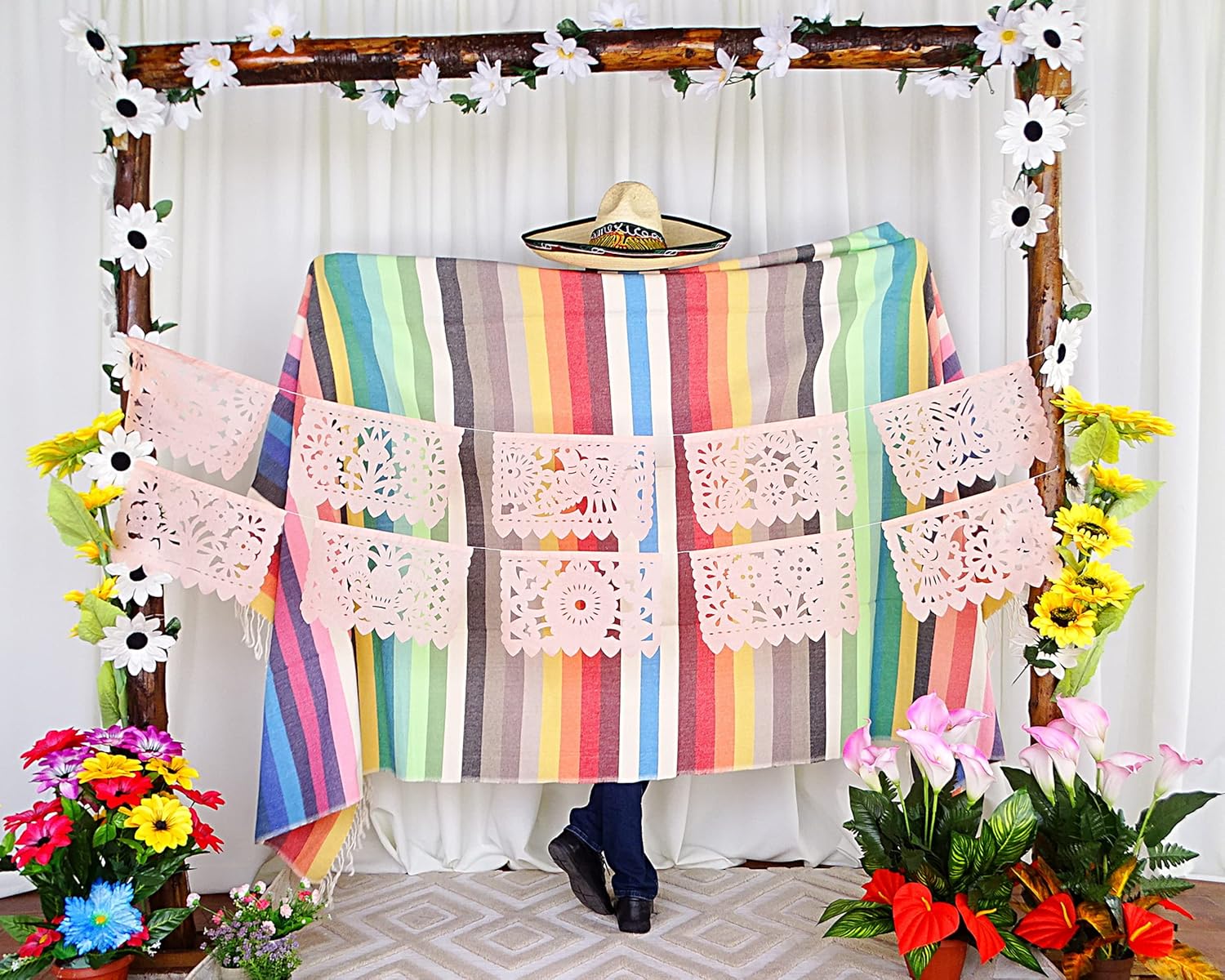 Over 60 feet of Peach papel picado! Hang these beautiful, Mexican Papel Picado banners at your next Mexican Fiesta! This Mexican Papel Picado Banner is hand crafted from tissue paper. Each rectangular piece measures 9 x 14 inches. Each colorful piece has a unique Mexican design. MexFabricSupplies offers high quality Mexican products such as papel picado banners, cinco de mayo decorations, fiesta party supplies, Mexican decor, and Mexican cloth napkins.