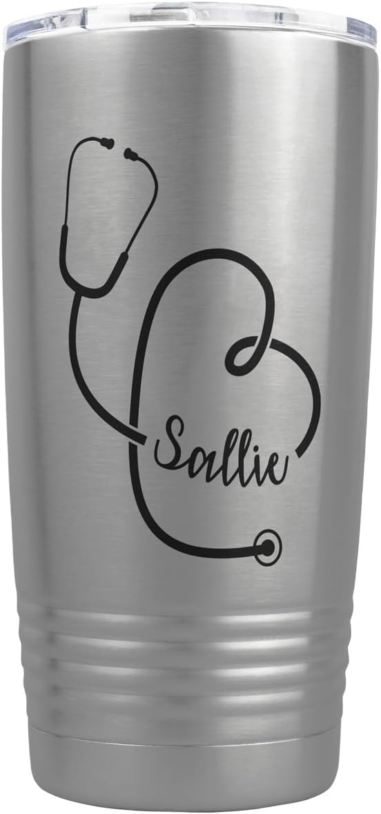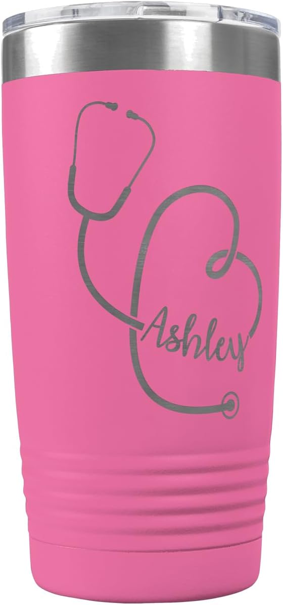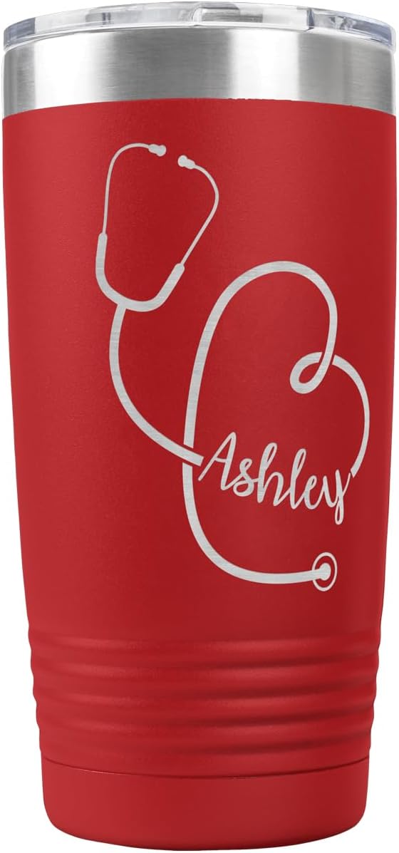 Surprise the medical professional or healthcare worker in your life with this customizable 20oz stethoscope tumbler. Provide your favorite nurse, dr, or healthcare workers name and our trained graphic designers will include the name within the design. These vacuum-insulated, thermal-control cups will keep your drink at just the right temperature for up to 24 hours! Enjoy perfect cold or hot beverages from morning to night. The clear lid has a perfect opening for sipping. This tumbler is perfect for traveling, lounging by the pool, camping, and more. The narrow bottom also fits in most car cup holders. Best of all, our tumblers are easy to customize. Customize these to create a matching set for your friends, give them as unique gifts at your next work retreat, personalize one as a cute present for mom, or get your favorite quote engraved for a daily dose of inspiration. With completely personalized text options, there will be no limits on what you can create with these portable stainless-steel mugs. Not only can you customize the text, but you can also pick from 15 different colors, such as red, blue, green, orange, teal, and more!