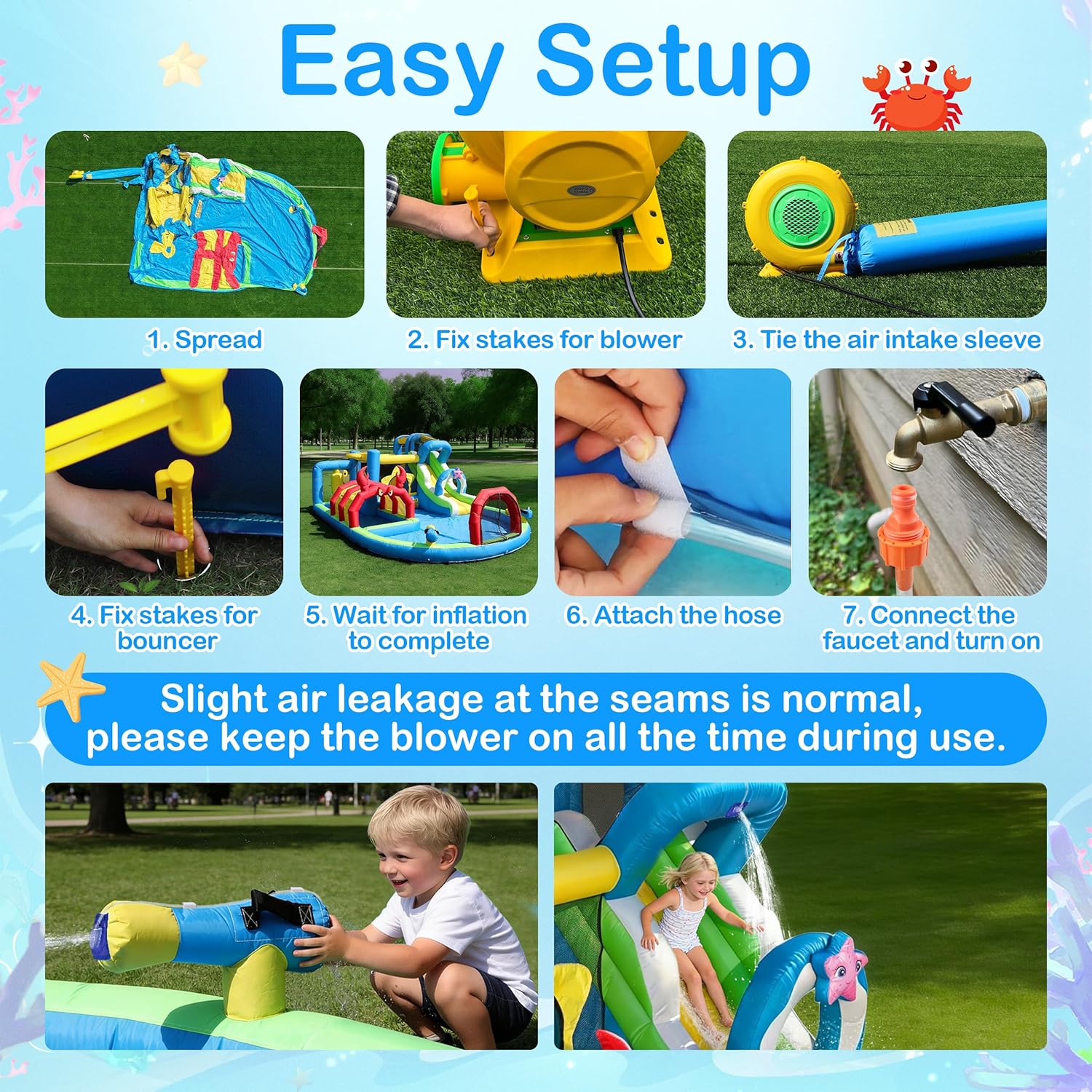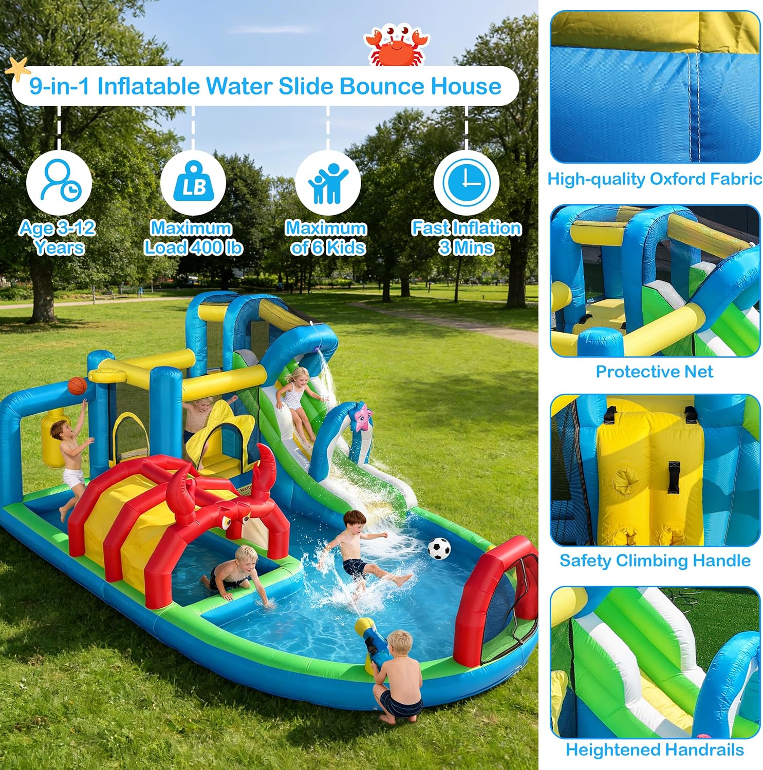 Transform your backyard into a water park adventure for kids with our TOAOB inflatable water slide! Perfect for birthdays, neighborhood gatherings, or sunny summer days, this slide provides long hours of outdoor excitement for your kids. Watch as they splash, climb, slide, shoot and giggle their way through endless fun and adventure!Get ready for non-stop excitement with our 9-in-1 Inflatable Water Slide! Packed with thrilling features like climbing walls, slides, basketball hoop,soccer goal, water cannons, and splash pools, this bounce house with water slide is the ultimate playground for kids aged 3-12. Material: Oxford fabricMaximum load capacity: 400lbMaximum of player: 6 KidsGross weight: 57.54lbSize: 16.4ft* 11.00ft*6.56ftFeatures: 1 slides, 2 water cannons, 1 bounce house