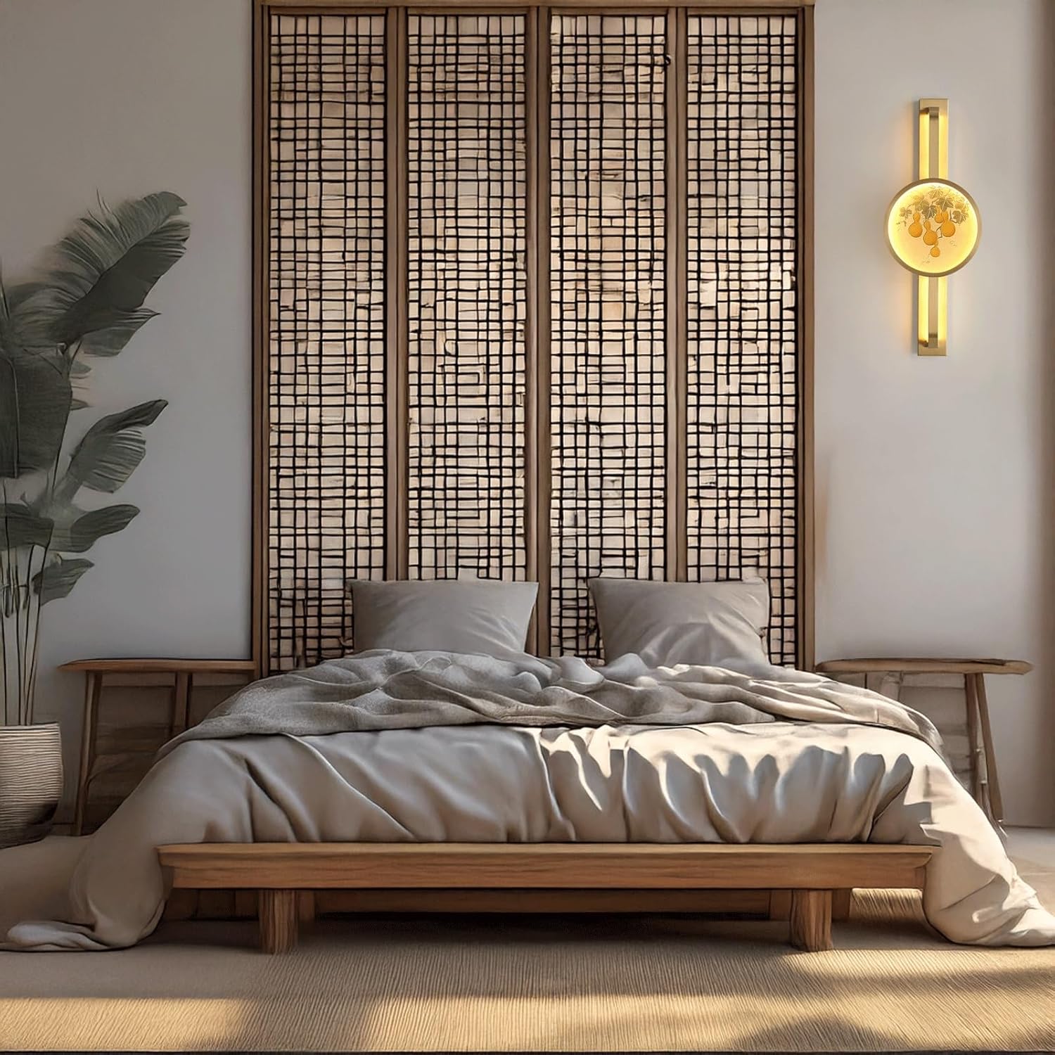 Product Parameters:Type: Wall Sconce / Wall LampStyle: Traditional Art, Modern Classic, Decorative, Ambient Lighting, ClassicMaterial: Copper (solid brass body with hand-carved and painted details)Color: Brass Tone (gold finish), Multi-color (gourd art panel)Dimensions:Small Size:Overall Height: 21.7" (55cm)Large Size:Overall Height: 31.5" (80cm)Common Dimensions:Overall Width: 7.9" (20cm)Projection from Wall: 3.9" (10cm)Vertical Strip Width: 2.4" (6cm)Light Source: LEDBulb Included: YesOptimized Special Feature: This traditional style 1-light LED wall sconce is a refined piece of art, showcasing traditional motifs with modern functionality. Crafted entirely from brass with a polished brass-tone finish, it features a central circular light panel adorned with hand-carved and painted gourd and vine patterns, symbolizing prosperity. This circular element is elegantly framed by and into a vertical rectangular brass strip, which also houses a luminous LED light on its inner edges. The built-in LED light source provides variable light color, illuminating the intricate art panel and casting a soft, ambient glow both horizontally and vertically. Available in two lengths, its blend of artistic detail and sleek design makes it a distinctive and decorative light source, ideal for living rooms, bedrooms, hallways, or entryways, enhancing a modern classic inspired décor.Applicable Space: Ideal for Living Room Accent, Bedroom Bedside, Hallway, Entryway, Dining Nook, Study Nook, Office, Hotel Room, or other spaces desiring traditional decorative lighting.